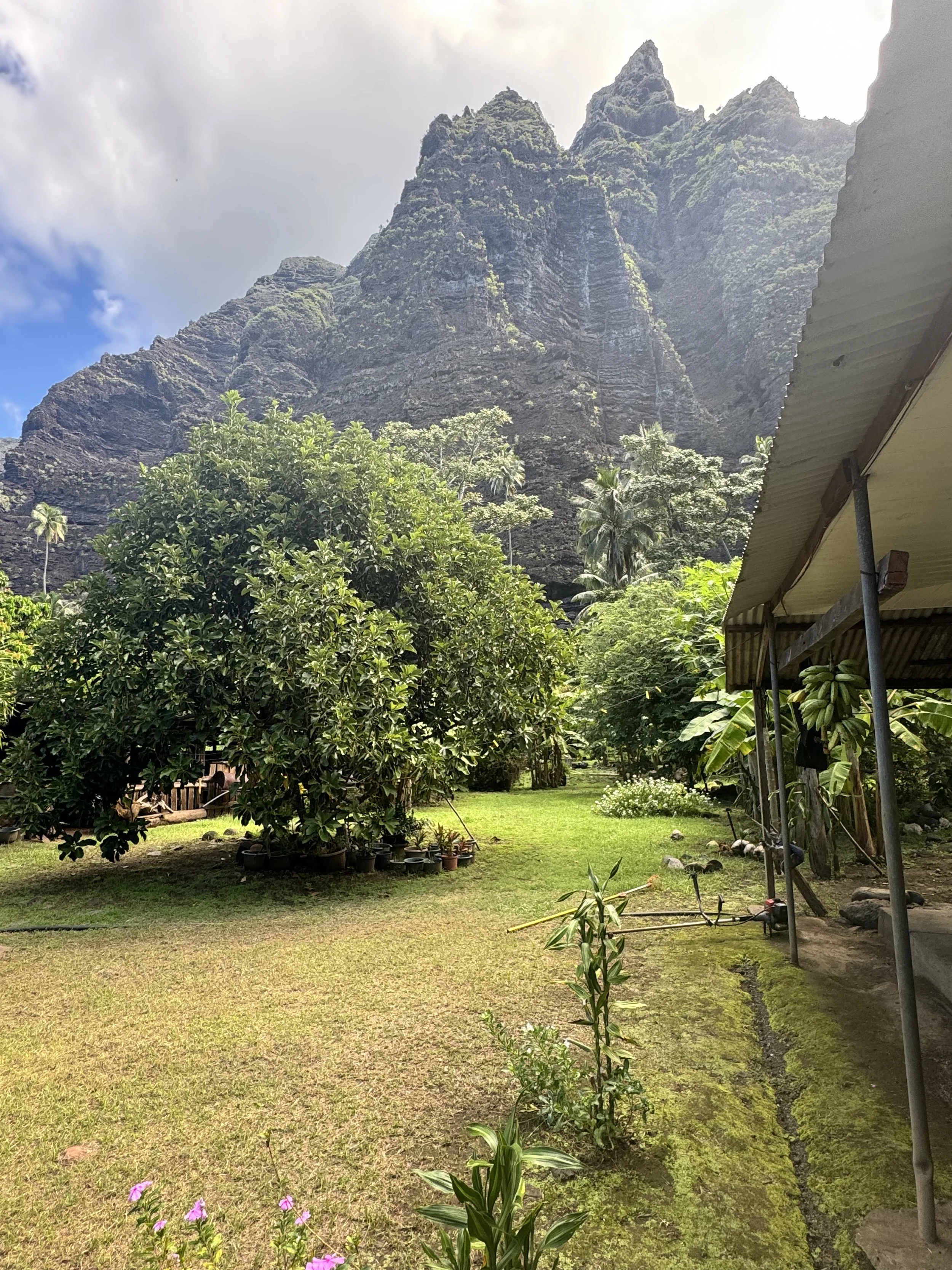 Back at the beach, a local couple Taiki and Huahei provided a perfect lunch: fresh grilled tuna marinated in herbs, green papaya salad, breadfruit fries, and fried bananas. Huahei chatted in her French-English, curious about our stories and eager to share hers. Later she introduced us to her grandmother Monette who sold us some of her freshly picked fruit: mangos, papayas, pomelos. She threw in star fruit and some other unidentified green oblongs…all from the garden she has tended her entire life.