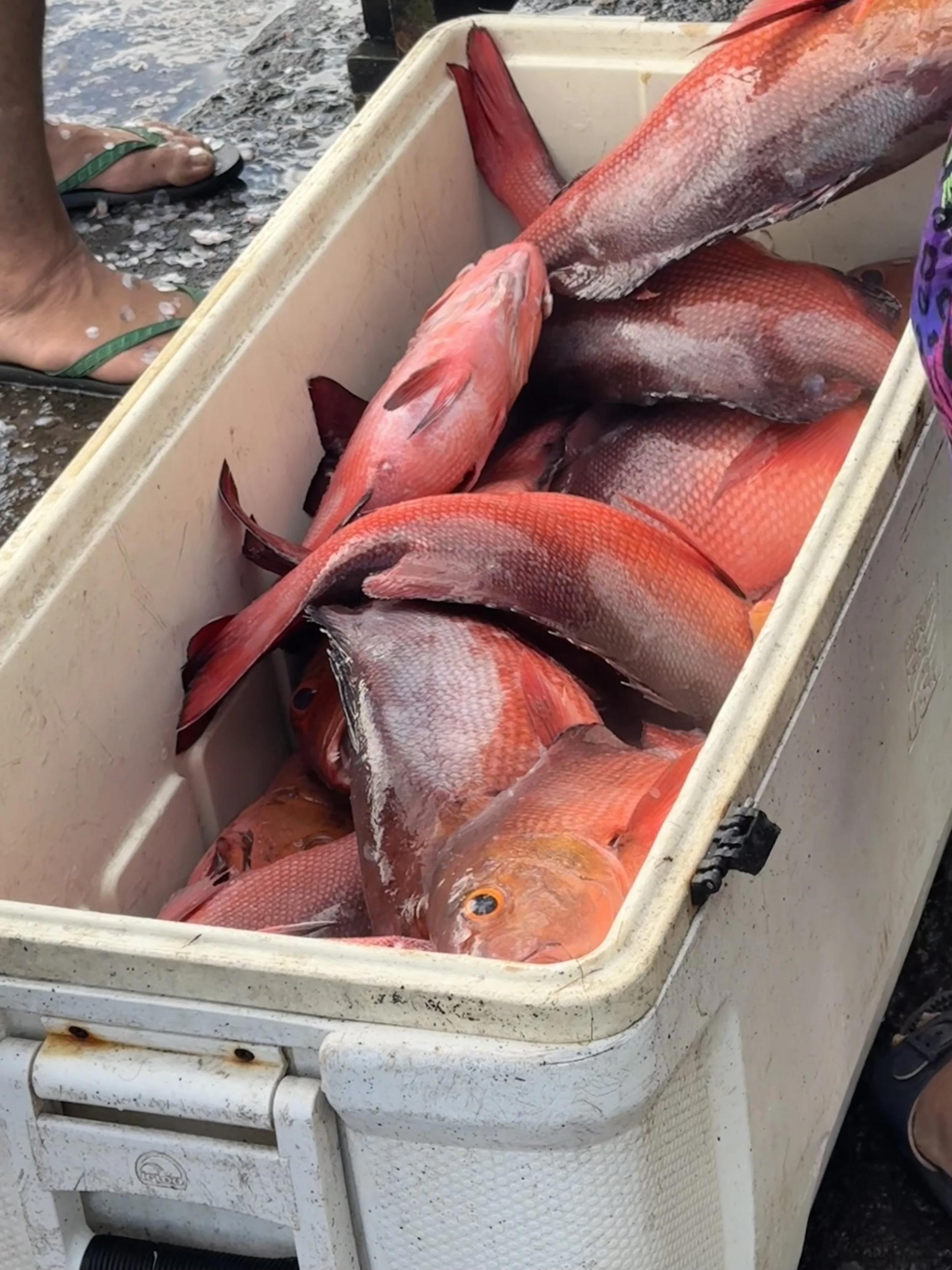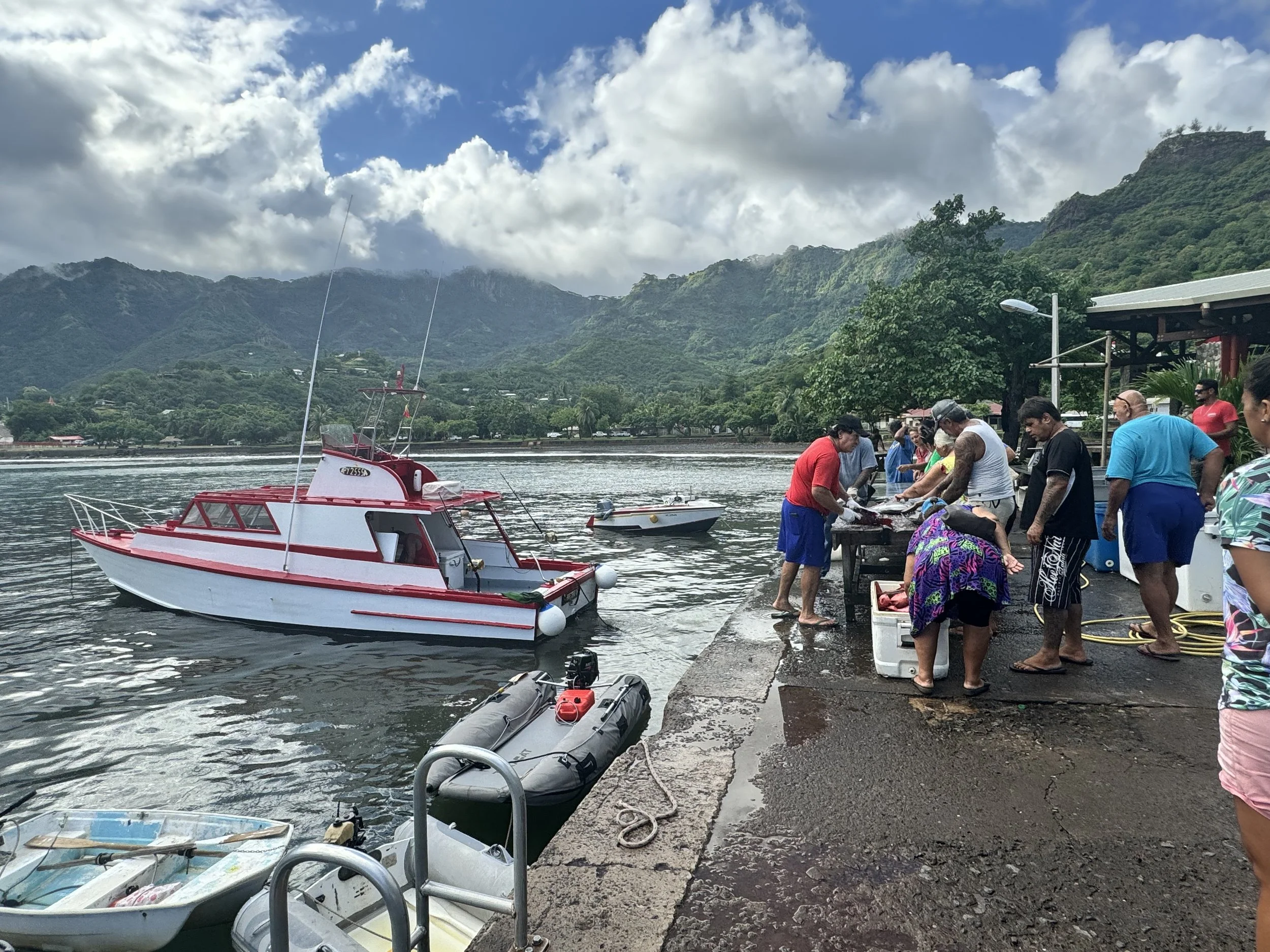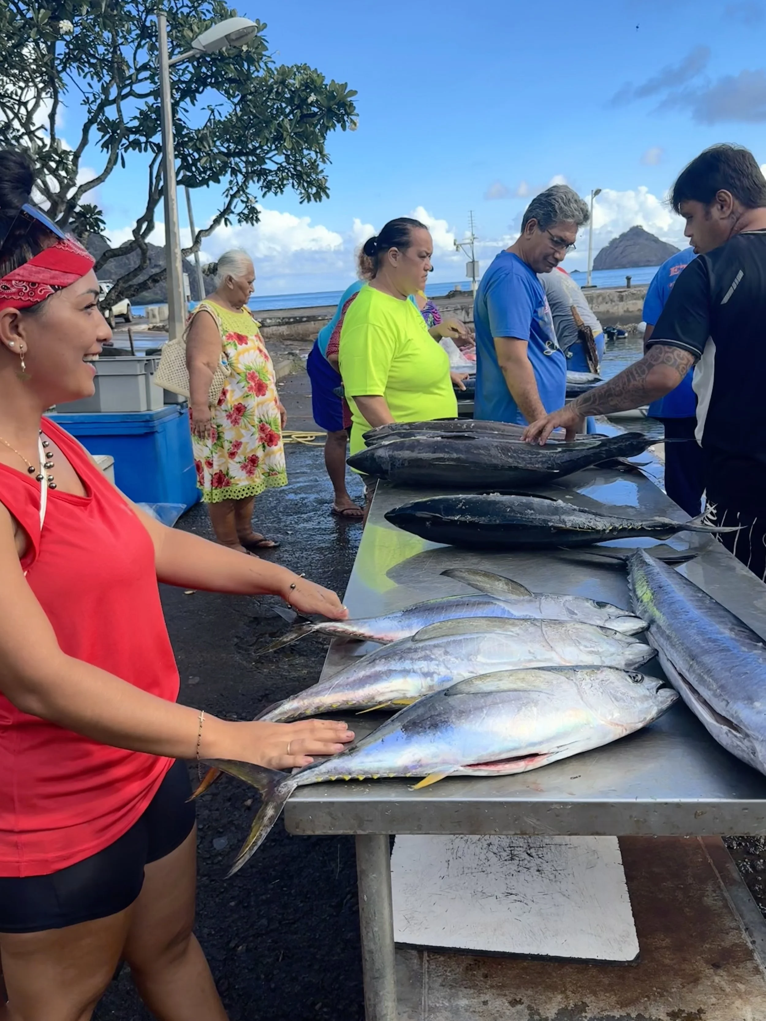 Later, Georgie and I hit the fish market: a temporary set-up on the quay where a fishing boat had just arrived. The fishermen unloaded buckets of red fish (snapper? squirrel fish?), barracuda, and more silver sea-beasts, a gang of men scrubbed off the scales with brushes, and others got to work gutting and skinning. Then the yellowfin tuna appeared, whisked away by the women who had waited for them in a quiet and orderly chaos. Except for one little fish that I somehow miraculously won. The patience and good humor surrounding those folding tables on the quay side was humbling