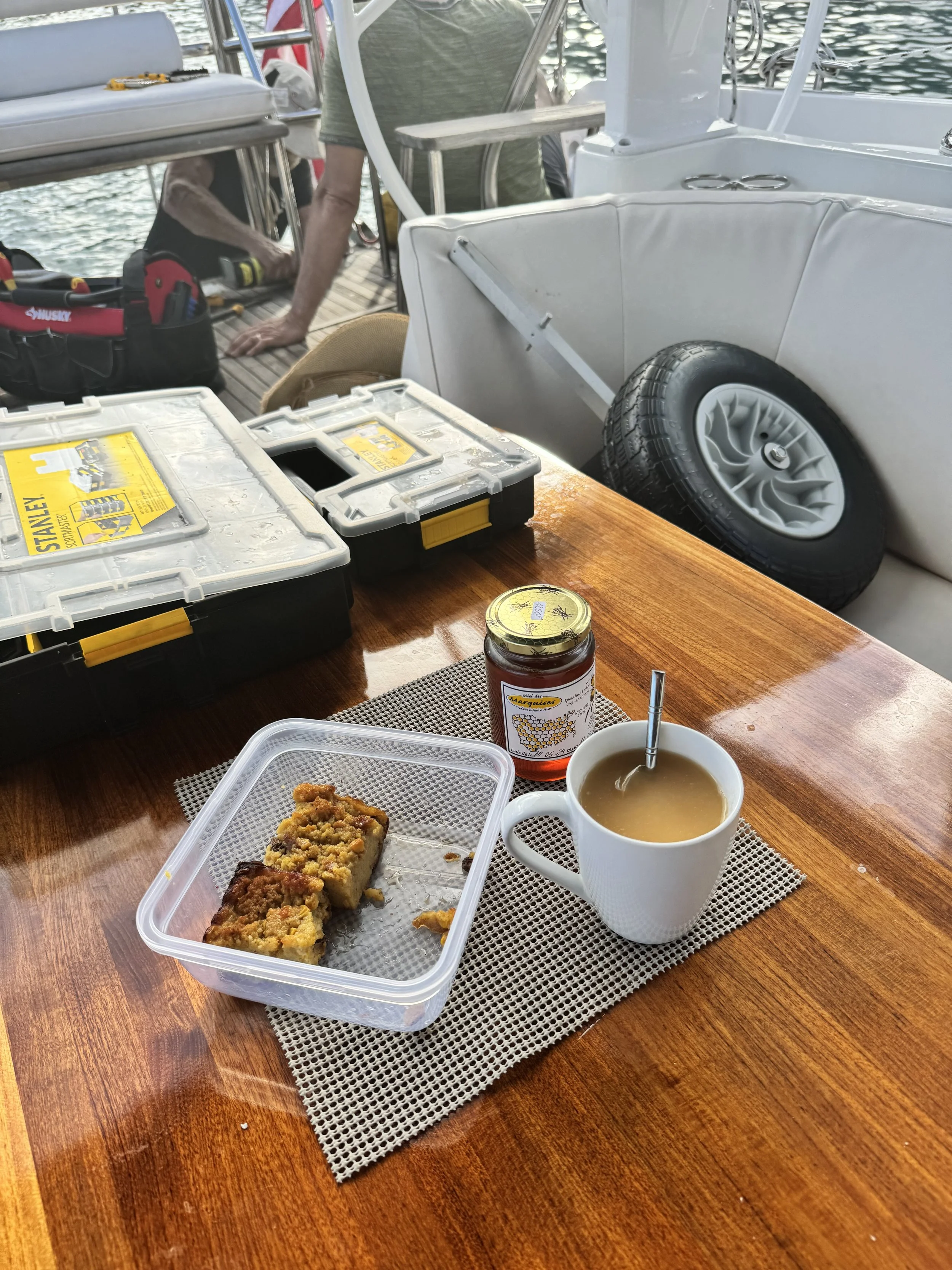 The remainder of the day was work: Georgie and I deep cleaned bathrooms and kitchen and floors, and the Mario Bros. did yet more work on the dinghy. (Does she really have an issue here, or do they just enjoy hanging over the rails together?)