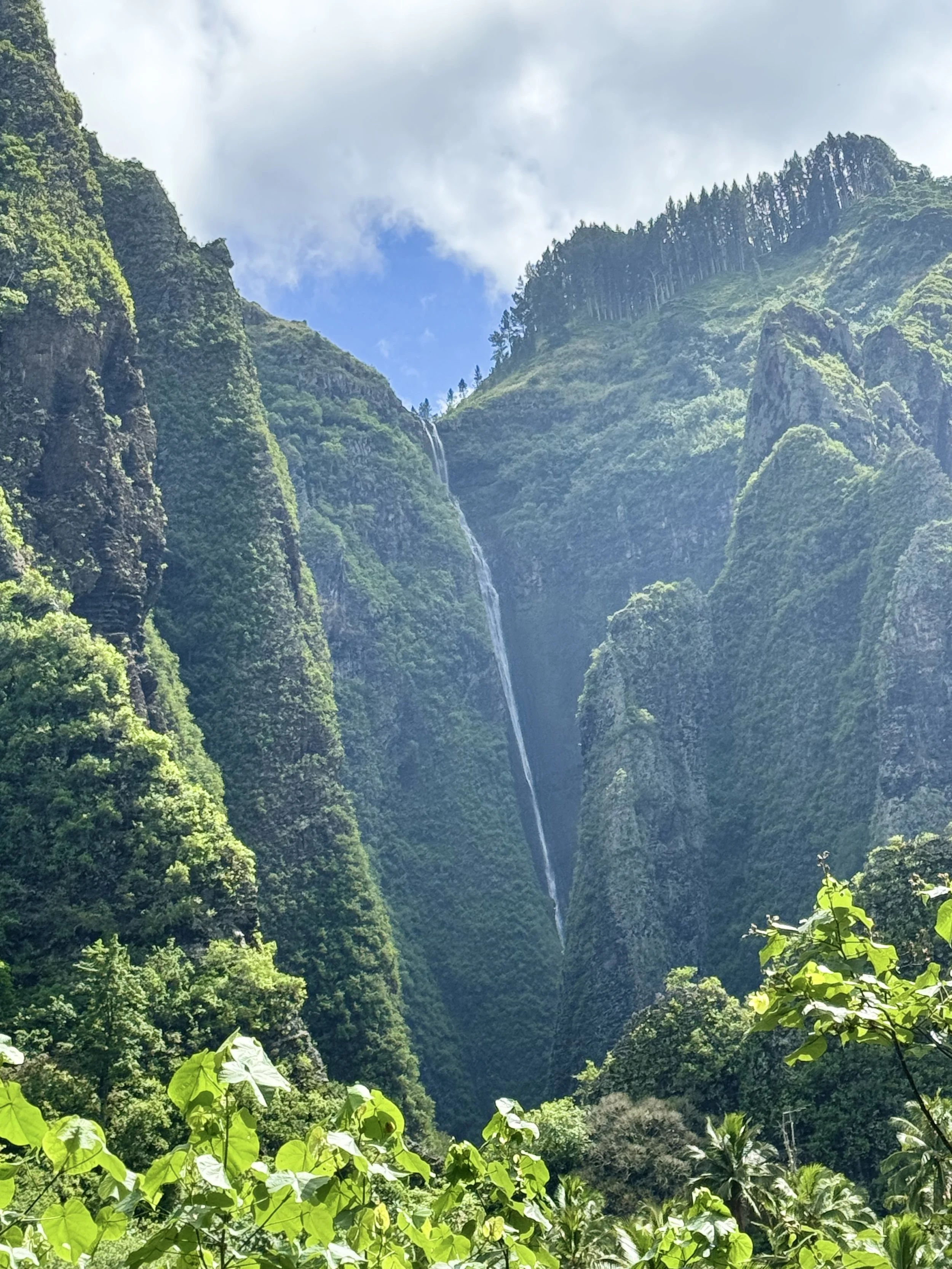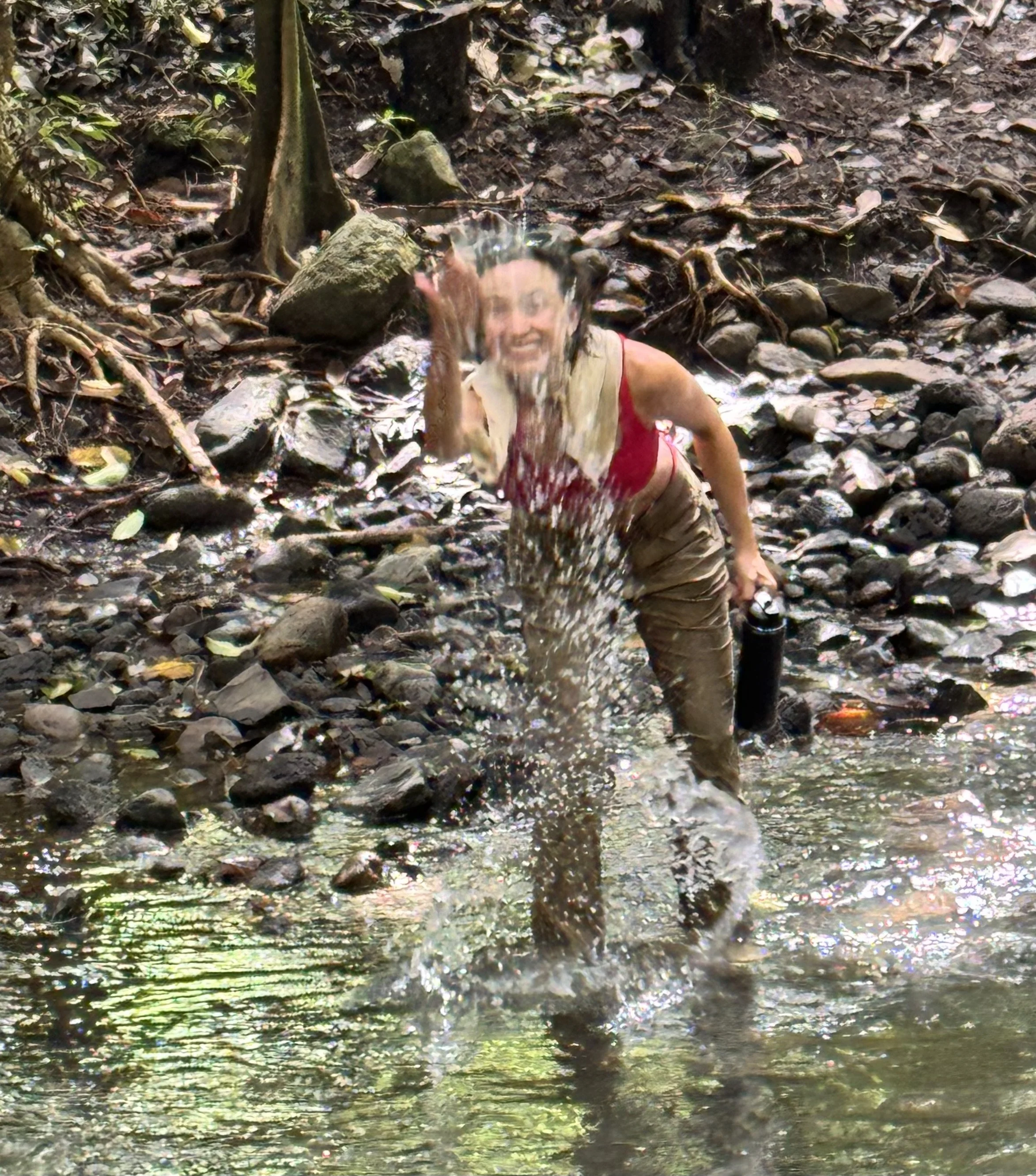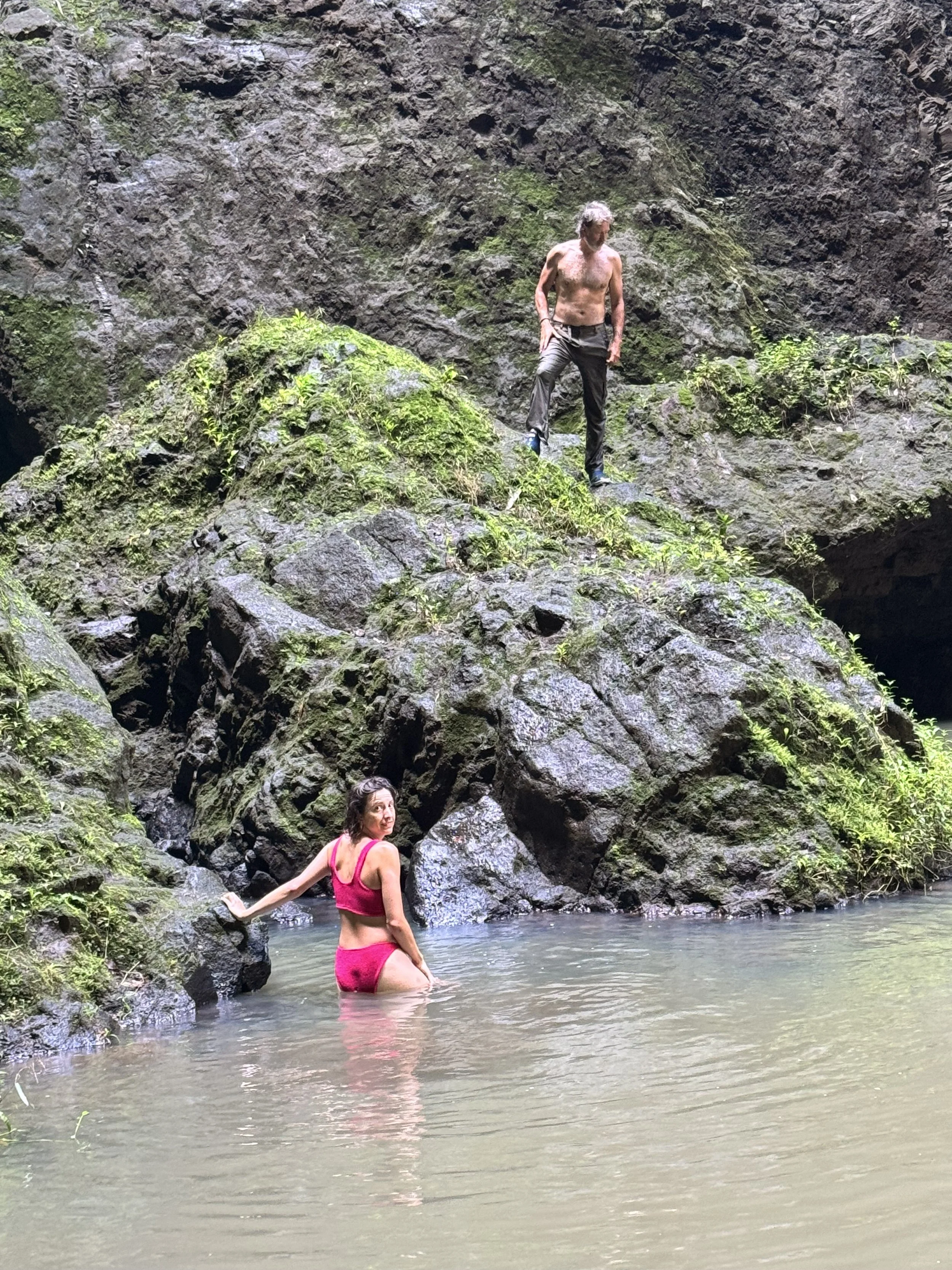 The Wild Thornberrys hiked again, this time up to a waterfall. As David and Georgie walked ahead, deep in conversation about something Very Important, I dreamed…listening to the birds, the roosters, the dogs, more birds, the river and finally the waterfall itself. Mud, rocks, fallen trees, streams, boulders, rivers, and finally a scramble and swim to the base. Vaipo is not even in the tallest 150 waterfalls in the world, but other than Hawai’i and New Zealand, it is at the top of Polynesia’s rankings with 1148 feet of water and vapor pouring into a pool below. Primal energy emanating from the basalt walls, the water, the very air itself.